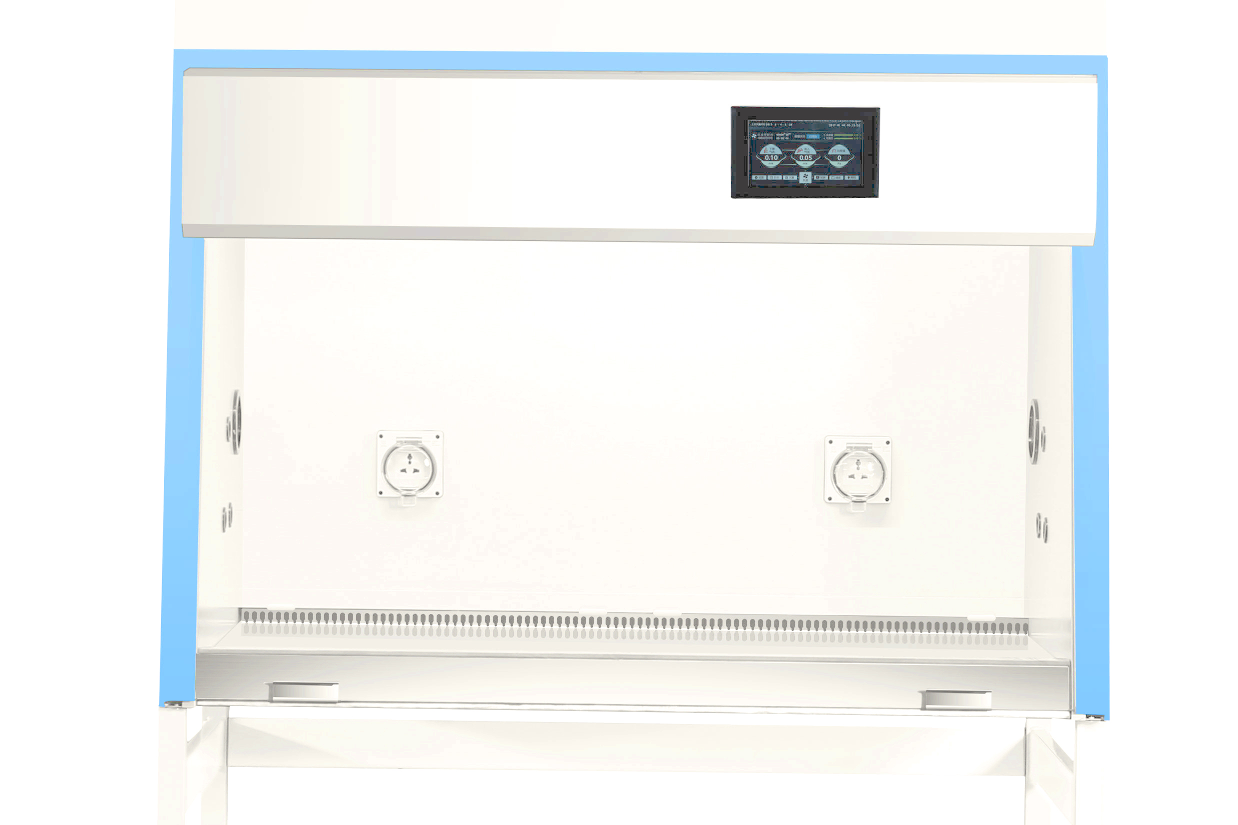 ▸ 7寸彩色触控人机交互界面显示屏,一个界面可以实时显示流入和下降气流风速、风机运行的时间进度,前窗的状态,过滤器、灭菌灯的寿命百分比,工作环境温度,控制插座、照明、灭菌及风机的输出和关闭操作,查看操作日志并提供报警功能,无需切换界面