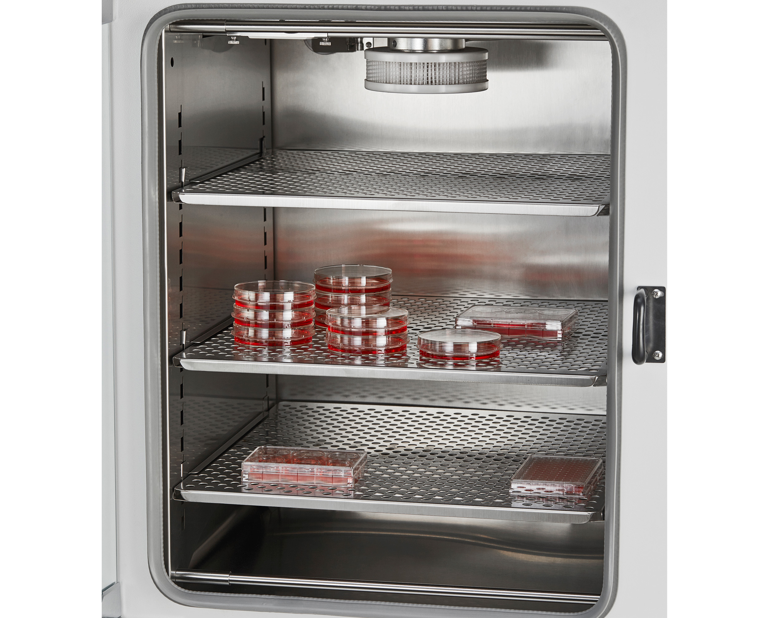 ▸ 腔体内置风扇能够温和地在整个腔体内吹动经过滤的潮湿空气,保证所有细胞无论放置在什么位置,培养环境条件都相同并且不会过度失水