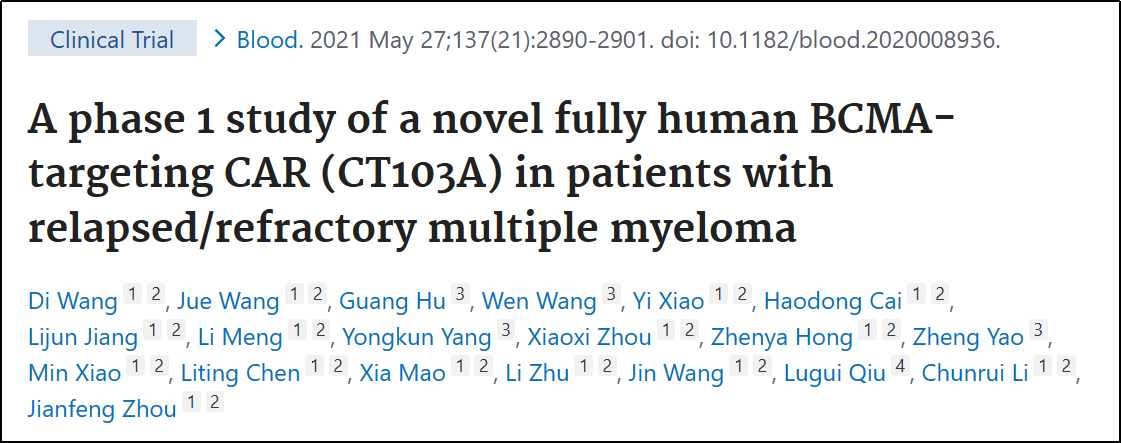 2. Wang D, Wang J, Hu G, et al. A phase 1 study of a novel fully human BCMA-targeting CAR (CT103A) in patients with relapsed/refractory multiple myeloma. Blood. 2021;137(21):2890-2901. doi:10.1182/blood.2020008936