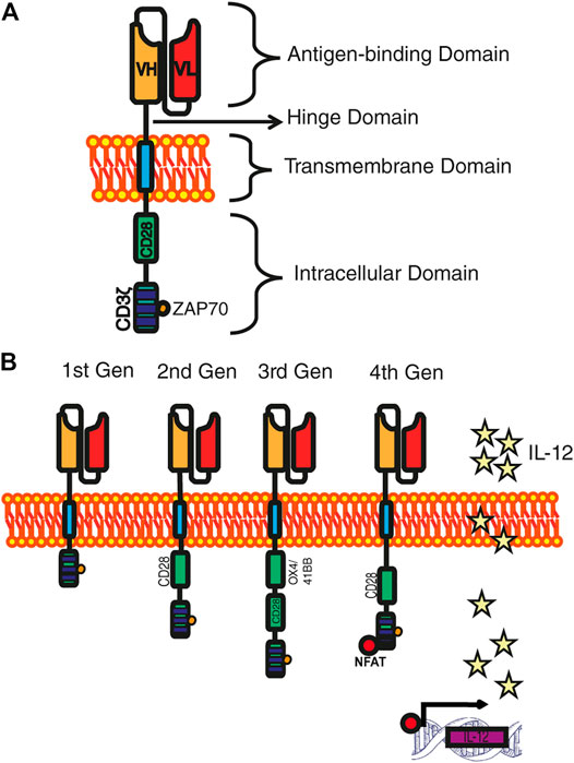简而言之,CAR-T疗法是通过基因导入方法(腺病毒,慢病毒,非病毒载体方式等),将抗原特异性CAR(胞外靶抗原结合域、铰链区、跨膜结合域和胞内信号传导结构域组成)导入患者T细胞,发挥杀伤肿瘤功能。胞内信号传导结构域直接影响CAR活化T细胞效果,根据结构不同CAR分为了四代,可谓是一代比一代进步。
