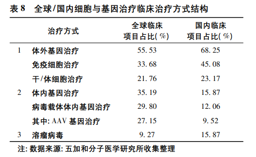 据国内数据统计,使用细胞基因疗法对抗恶性肿瘤治疗应用占据绝对的第一,临床项目占比高达 61%,其中,免疫细胞治疗占72%,溶瘤病毒治疗占 26%。第二位是血液系统疾病,占比接近7%,体外细胞基因治疗与体内基因治疗各占一半,在体内基因治疗中,全部采用 AAV 基因治疗。第三位则是眼科遗传病,约占 6%